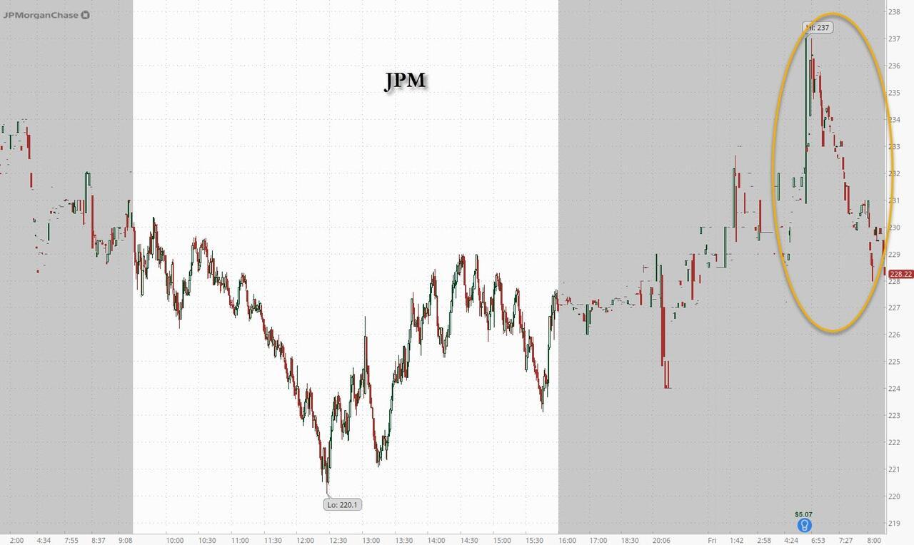 JPM stock first spiked after hours as algos focused only on the top and bottom line beats, but as attention shifted to the surge in reserve build and the misses inside trading, the stock has started to leak and is now back to unchanged.