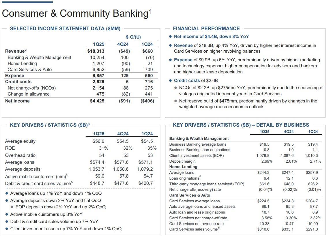 Looking at the consumer bank, total Loans were $1.36 trillion, beating estimate $1.35 trillion while total deposits $2.50 trillion, beating estimate $2.42 trillion.