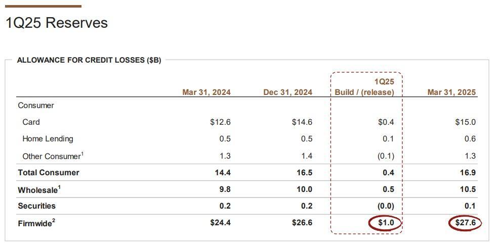 - The bank said that “the net reserve build of $973 million included $549 million in Wholesale and $441 million in Consumer and was largely driven by changes in the weighted-average macroeconomic outlook”