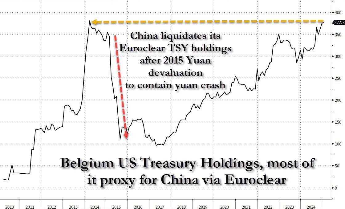 Which brings up an interesting point: we already discussed how China's central bank, the PBOC (which of course is joined at the hip with the CCP) is doing everything in its power to bolster Beijing in its trade war, be it propping up the market by purchasing record amounts of ETFs/stocks, to making sure the yuan doesn't crater, and is actively buying the currency (through intermediary banks) while selling the dollar. And, by extension, China is securing the funds it needs to support the currency by selling US treasuries it holds in its reserve, whether domestically or in Belgium via Euroclear... where it appears total TSY holdings are now where they were just before China devalued the yuan in 2015 and liquidated its US paper to contain the subsequent yuan collapse. Expect a similar collapse if and when China devalues this time as Beijing will again scramble to avoid a much worse liquidation in the yuan.