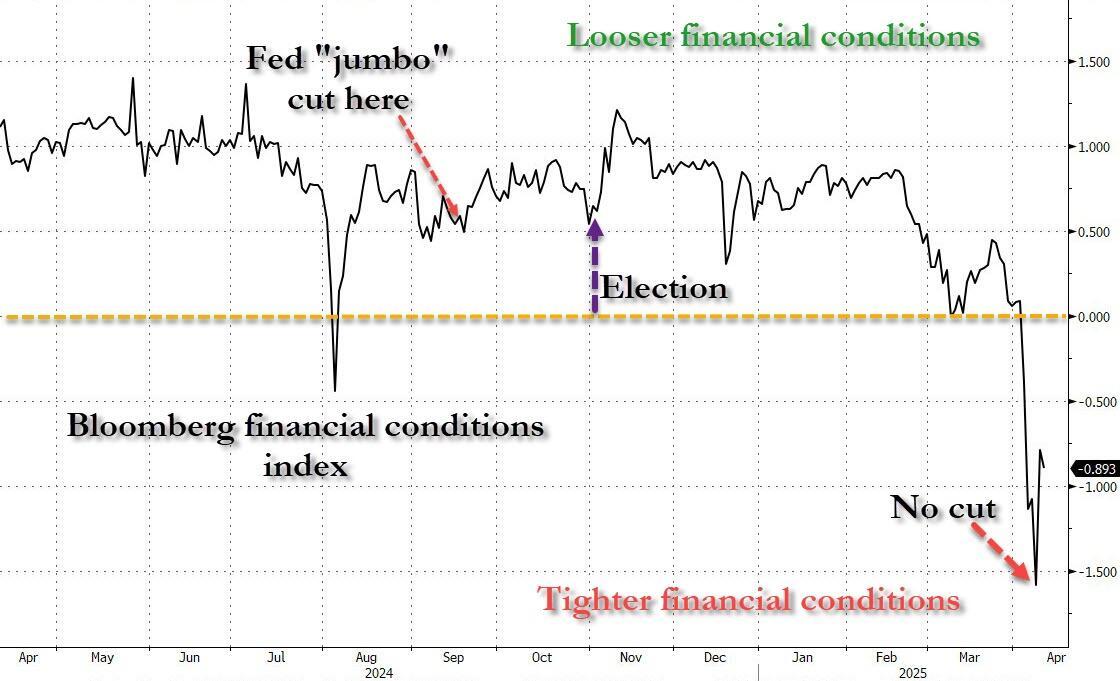 Which is amusing considering the Fed was "jumbo" cutting last September when financial conditions were massively looser and when forward inflation expectations were much higher than they are now.