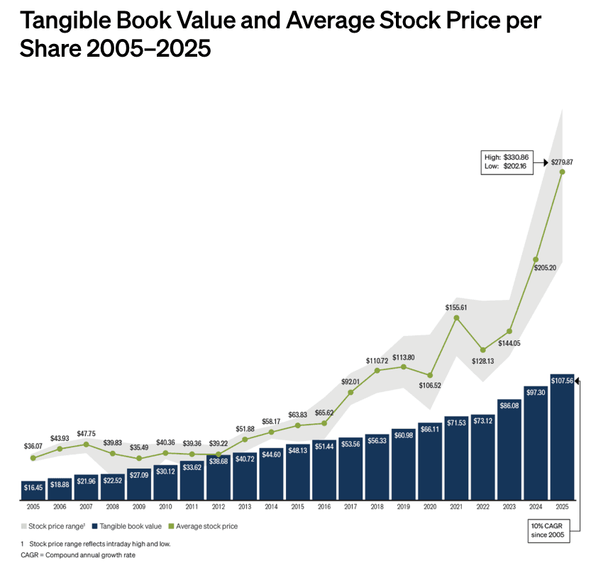 The largest U.S. bank said 2025 revenue rose to a record $185.6 billion, while net income reached $57 billion and return on tangible common equity (ROTCE) was 20%. JPM also lifted its quarterly dividend twice during the year, to $1.50 a share from $1.25, as it continued to note the strength of its balance sheet.
