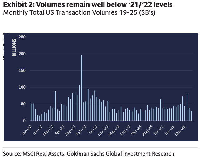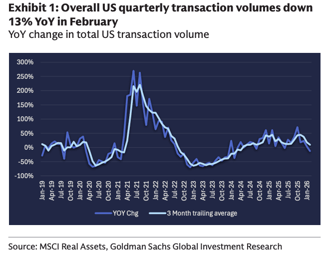Goldman real estate analyst Julien Blouin wrote Wednesday that the initial February reading on CRE transaction volumes showed a 13% year-over-year decline. He noted that transaction data from MSCI Real Assets is typically "revised materially higher" and said the early print is not a major cause for concern.