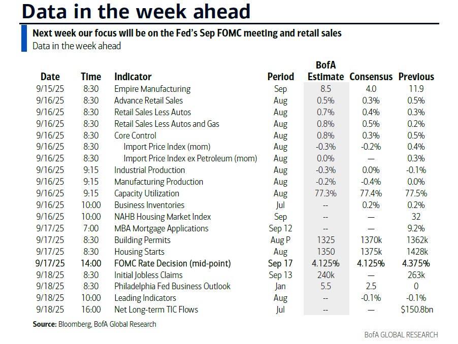 Looking at just the US, Goldman writes that the key economic data releases this week are the retail sales report on Tuesday and the Philly Fed manufacturing index on Thursday. The September FOMC meeting is this week. The post-meeting statement will be released at 2:00 PM ET, followed by Chair Powell’s press conference at 2:30 PM.