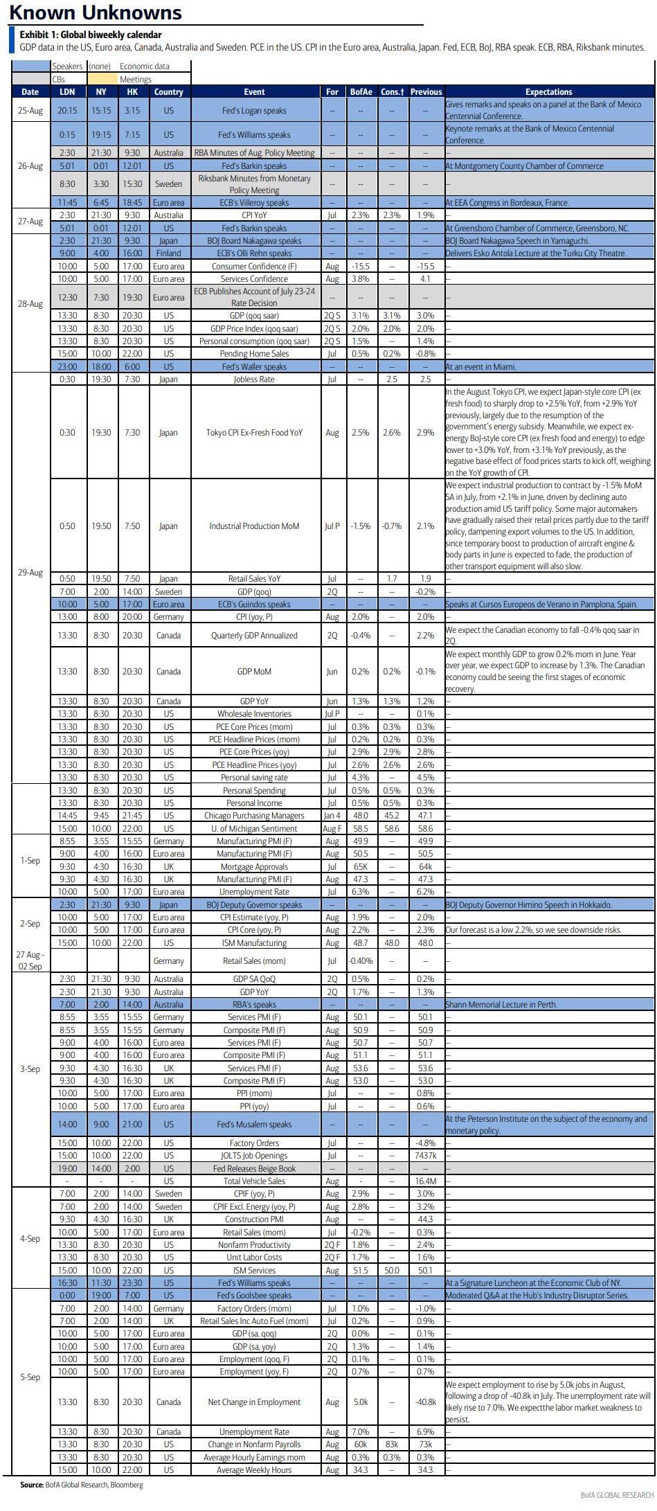- Central banks: Fed's Waller speaks, ECB's account of the July meeting, ECB's Rehn speaks, BoJ's Nakagawa speaks