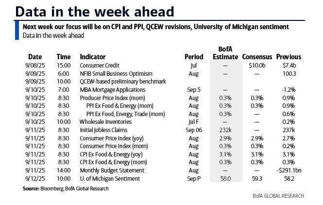 Usually the post-payrolls week is quieter but not this time, as we get another bumper week of events as we build to next week's FOMC. Although the Fed is now on its media blackout, Wednesday's PPI and especially Thursday's CPI will shape pricing ahead of that (note that the traditional order of CPI before PPI is flipped this week), with all eyes still focused on the tariff impact. 28bps of cuts are now priced in for the next meeting, so a quarter-point cut is fully priced but without much being priced in for a 50bps move (that will change after tomorrow's negative benchmark revision). DB economists believe you’d need to see pretty weak inflation this week to get that. We preview that US inflation data below but before we do the main highlights for the rest of the week are: the French confidence vote in the National Assembly, German industrial production and the New York Fed’s inflation expectations today; the preliminary annual benchmark revisions by the US BLS for payrolls tomorrow; Chinese inflation, the State of the Union address by European Commission President von der Leyen, and a 10yr UST auction on Wednesday; the ECB decision and a 30yr UST auction on Thursday; and finally on Friday there’s the University of Michigan survey.