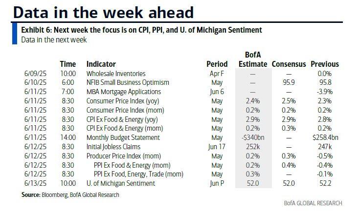 Finally, looking at the US, Goldman notes that the key economic data releases this week are the CPI report on Wednesday and the University of Michigan report on Friday. Fed officials are not expected to comment on monetary policy this week, reflecting the blackout period ahead of the June FOMC meeting.