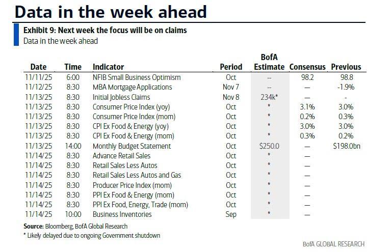 Turning just to the US, Goldman says that assuming the shutdown ends in mid-November, the bank expects the release of the September employment report a few days after reopening. The statistical agencies will announce new release dates for the other postponed releases in advance. If the BLS decides to release the October employment report, expect its release along with the November report either on schedule on December 5 or delayed by one week.