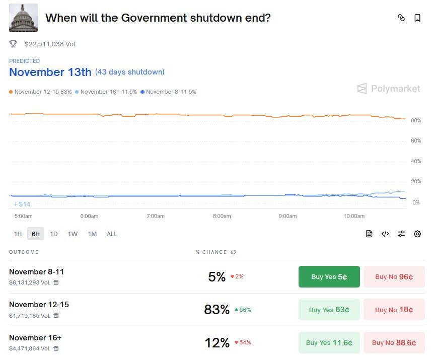 Probability markets are starting to price in the end game with a 88% expectation that the shutdown will be over by November 16th on Polymarket, a contract high.