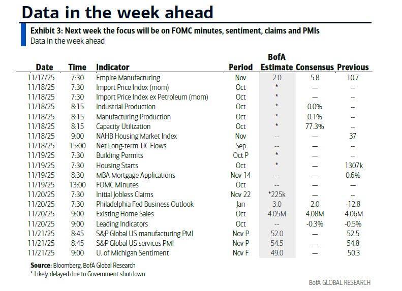 Finally, looking at just the US, Goldman writes that with the government now open, it expects the statistical agencies to continue updating their data release schedules over the coming days. There are several speaking engagements from Fed officials this week, including a speech on the economic outlook by Vice Chair Jefferson on Monday. The minutes to the FOMC’s October meeting will be released on Wednesday.