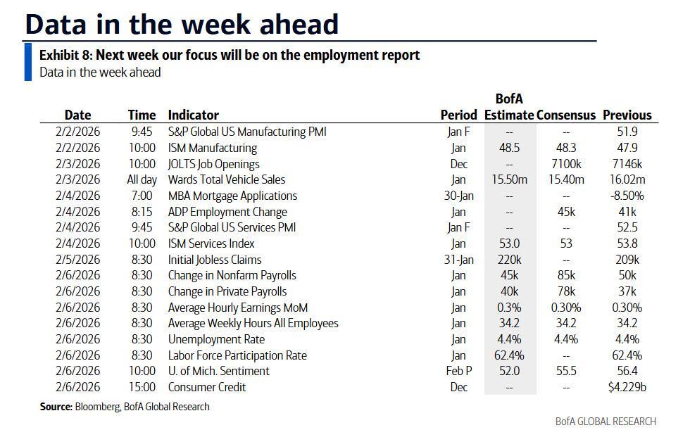 Finally, looking at just the US, Goldman writes that the key economic data release this week is the employment report on Friday. There are several speaking engagements by Fed officials scheduled this week, including events with Governors Bowman and Cook and Vice Chair Jefferson