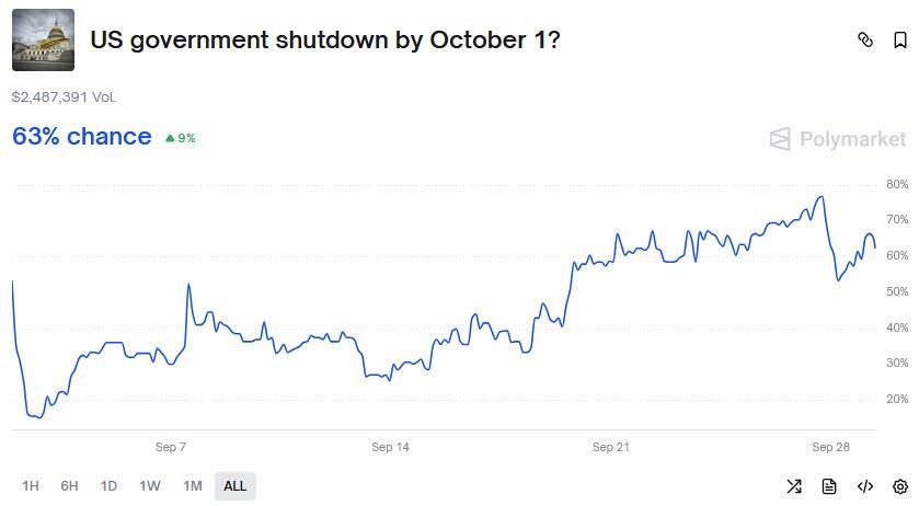 Turning to the week's main event, fears of a shutdown rose significantly last week, particularly after Trump cancelled a meeting planned with the Democratic leaders in the House and the Senate. But yesterday we heard that Trump will be meeting Democrat and Republican leaders today to try to broker a deal. So that helped the probability of a shutdown this year on Polymarket to fall from 84% yesterday to 63% this morning.