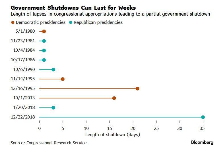 If there is a shutdown, all non-essential federal employees would be furloughed, which DB's economists estimate would cost the economy 0.2% per week on an annualized GDP basis. The longest shutdown was the 35 days straddling the end of 2018 and start of 2019. In 1996, we had one for 21 days and in 2013 one lasting 16 days. Others have lasted a few days or even only hours and before federal workers' alarm clocks went off.