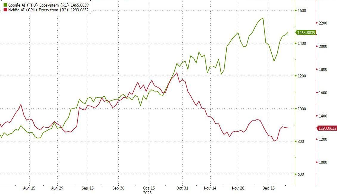 With today's purchase, pardon, "licensing deal", Nvidia has formally lobbed its response to Google's recent ascent with its Ironwood TPU and Gemini AI, which saw a dramatic divergence in the Google vs Nvidia ecosystems (chart below). The question now is will Google issue its own "code red" and pull every string in its power to kill the deal, or will it respond even more forcefully. One thing is certain: if Nvidia has now successfully caught up to Google and its TPU technology, the alligator jaws of the Google vs OpenAI/Nvidia chart are about to slam shut.