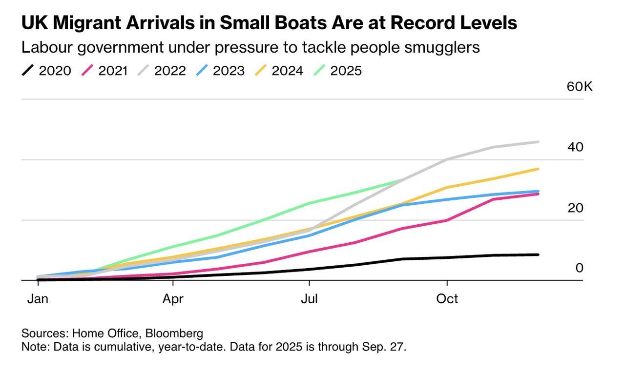 The UK recorded its largest-ever migrant crossing on a single vessel this weekend, according to Bloomberg - piling further pressure on Prime Minister Keir Starmer as his Labour Party convenes for its annual conference in Liverpool.