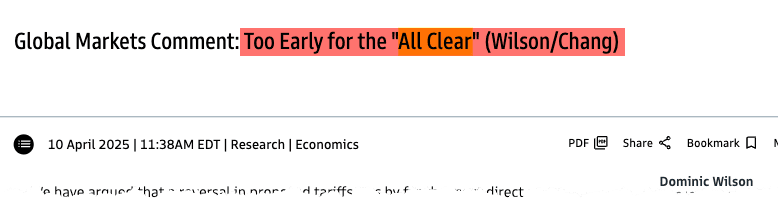 What's clear is that global trade disruptions are emerging, and this risk suggests to Goldman analysts that it's still too early to give the "all clear" for markets.