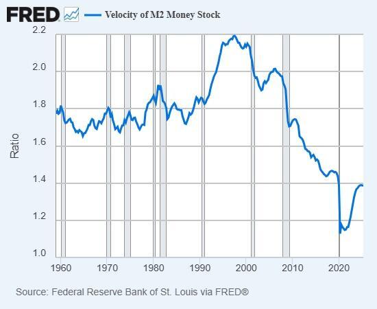 By the pre-Covid high watermark of Q1 2020, M2 was $15.5 trillion and GDP was $21.7 trillion. After the Covid crash and stimulus, here in Q2 2025 M2 is $22.1 trillion and GDP is $30.3 trillion-- 1 to 1.37.