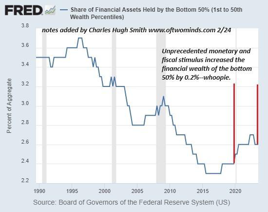 Well, not everyone, because only the top 10% own enough assets to feel "the wealth effect," but since they account for 50% of all consumer spending, that's enough to maintain the status quo, in which the bottom 90% lose ground (especially the bottom 60%) and the top 10% are doing splendidly.