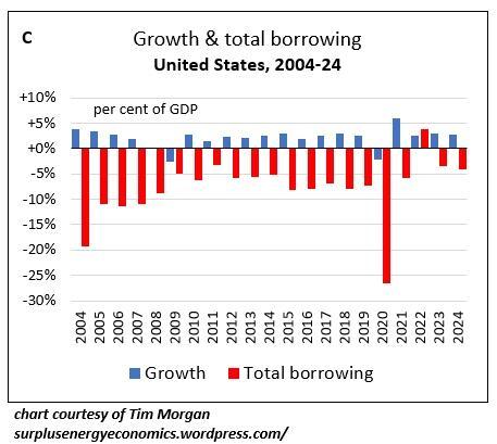 Lastly, consider this chart of debt and growth in the US, courtesy of Tim Morgan of the invaluable analytic site Surplus Energy Economics. Note that the blue indicators of growth are considerably smaller than the red indicators of debt.