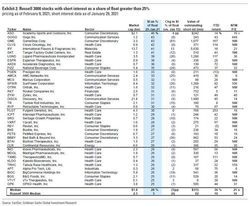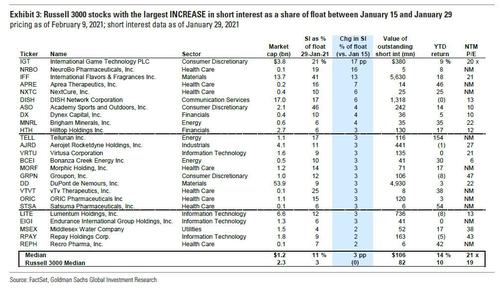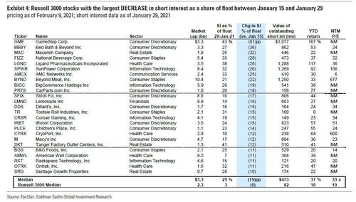 So using an analysis we first conducted three weeks ago as a reference - when we laid out the most shorted Russell 3000 names - Goldman's David Kostin has assembled the Russell 3000 stocks with the largest outstanding short interest as a share of float as of Jan 29, as well as the largest recent changes in short interest as a share of float.