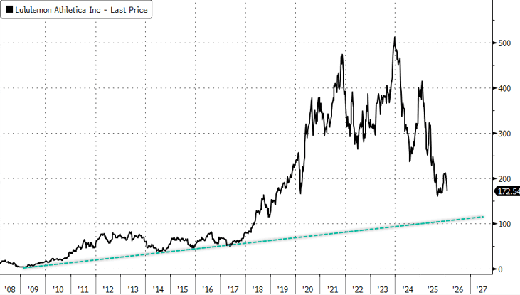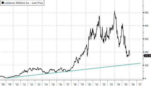 Meanwhile, Alo Yoga and Vuori are winning influencers and younger customers; Lululemon's attempts to follow that playbook have epically backfired. Year-to-date, shares are down 17%, below Covid lows.