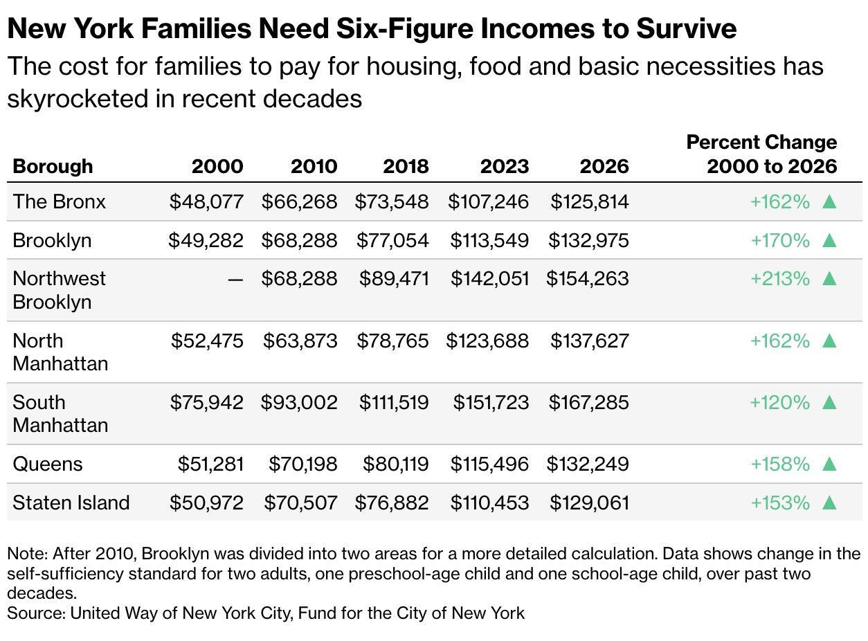 Costs have surged dramatically over time. In the Bronx, a two-parent household with two children now needs about $125,814 annually—up 162% from 2000. In Northwest Brooklyn, that figure reaches roughly $154,000, more than triple the borough’s earlier benchmark. Every borough has seen similar triple-digit increases.
