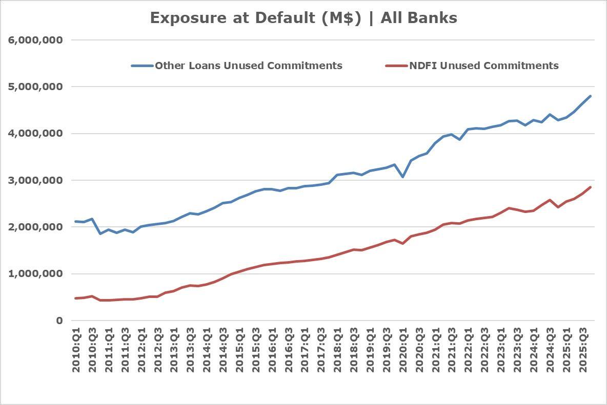 When you see a bank asset class growing far more quickly than the broad economy, this is a red flag that suggests potential systemic risk. But even more troubling that the high rate of growth in bank lending to NDFIs is the huge amount of undrawn loans available to these lightly capitalized companies involved in private equity and credit.