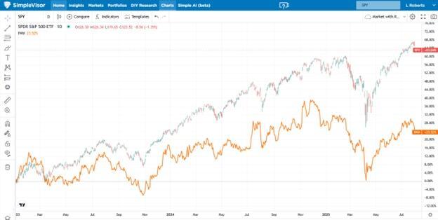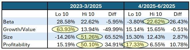 The table below shows which factors were favored or out of favor during the bullish trend leading up to the tariff-induced decline and during the recent recovery. As shown, growth, large market cap, and high profitability were preferred before April. Not surprisingly, those traits characterize the Magnificent Seven. However, since the April lows, high beta and low profitability have been driving the market.
