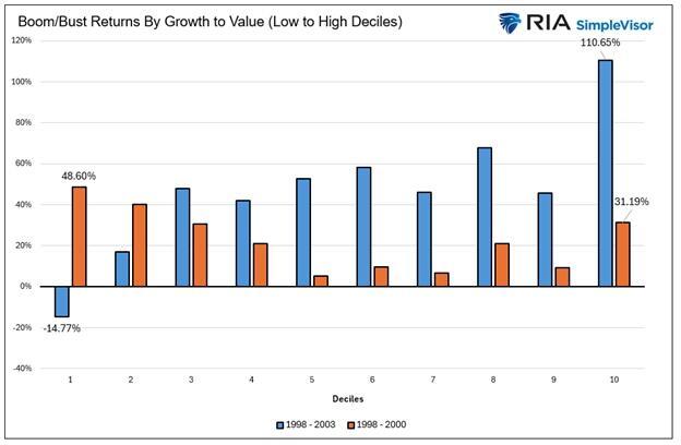 Similarly, as portfolio managers, we need to invest for today’s market while maintaining a plan for tomorrow. Accordingly, let’s look beyond high and low-beta stocks and examine how other stock factors performed during the dotcom boom-bust era. This will provide a roster of the types of stocks that may thrive if the current speculative melt-up melts down.