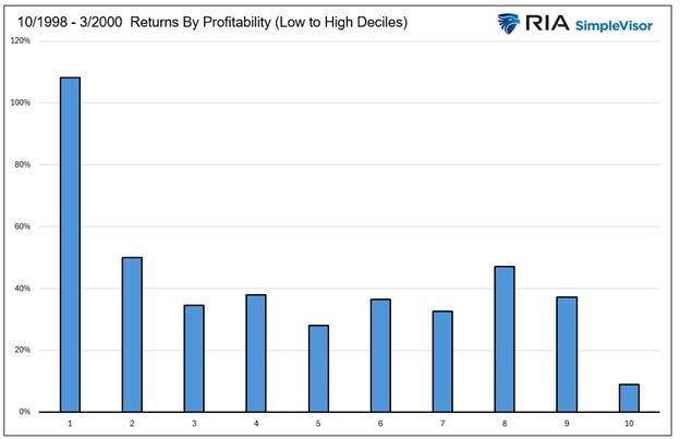 One of the recent themes, alongside high beta, that has emerged is profitability. Many of the stocks with the most impressive gains over the past three months have little to no profits. Similarly, the 1998-2000 boom was driven by stocks with poor profitability. At the time, investors were not concerned about current earnings. They were more captivated by potential future profitability.