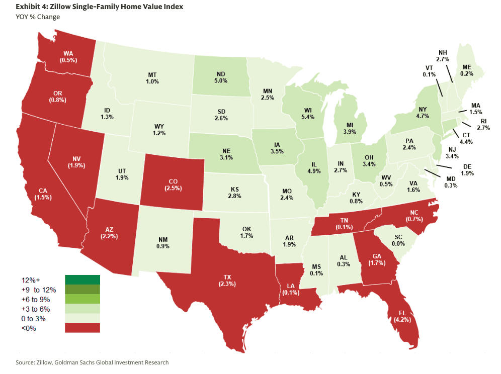 Goldman analysts, led by Susan Maklari, provided clients on Friday with a snapshot of homebuilders across America and a housing heat map suggesting continued sluggishness across the industry.