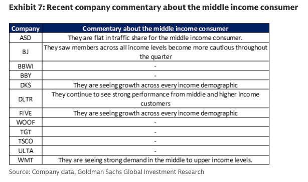 Goldman analysts examined twelve companies (all within the GS coverage) with high exposure to middle-income consumers, including Walmart, Best Buy, Target, BJ’s Wholesale Club, Tractor Supply, Academy Sports + Outdoors, Dick’s Sporting Goods, Ulta Beauty, Petco, Bath & Body Works, Five Below, and Dollar Tree.