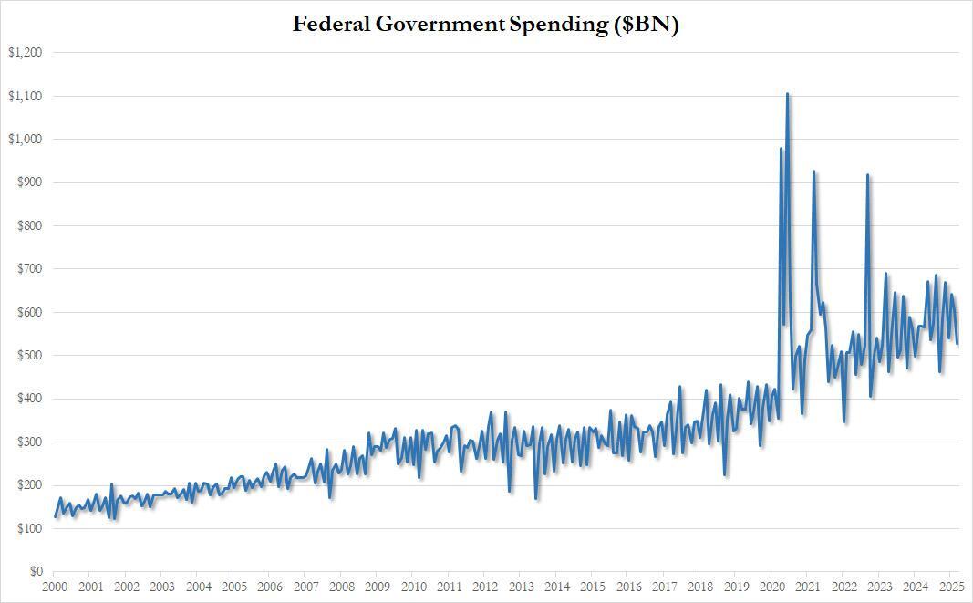 While various mandatory spending categories posted continued gradual increases - after all, these require an act of Congress to be revised - there was a huge, $45 billion drop in Income Security, from $105 billion in February to $60 billion in March, the largest one month decline since June 2021 as Elon ripped up much of the massive fraudulent fund flow network Democrats had established in recent decades and covered up simply as 'income security' (see "Elon Musk alleges $50B in fraud at Treasury after judge blocks DOGE audit", Elon Musk’s DOGE discovers millions in taxpayer dollars wasted on unemployment claims for ‘fake people’, Elon Musk Says DOGE Will Produce Savings Of $150 Billion In FY2026) when it really was a giant slush fund used for everything from graft, to corruption, to bribes, to paying leftist media for favorable coverage.