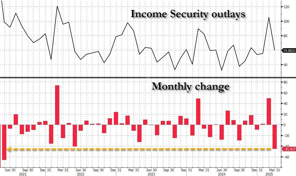 Bottom line: While March was the first month in which we saw the budget-busting effect of DOGE finally come to the fore, the Sisyphean challenge for the Dept of Government Efficiency is just starting, because while a $50BN drop in "Income Security" and a $76 billion decline in the deficit YoY is a terrific start, the reality is that this is a mere drop in the bucket for the unsustainable trajectory which the US is on, and if Trump, Musk, DOGE and the majority of Americans truly hope to rightsize the US balance sheet, a lot more work - and as the last few days have shown - a lot more pain is coming.