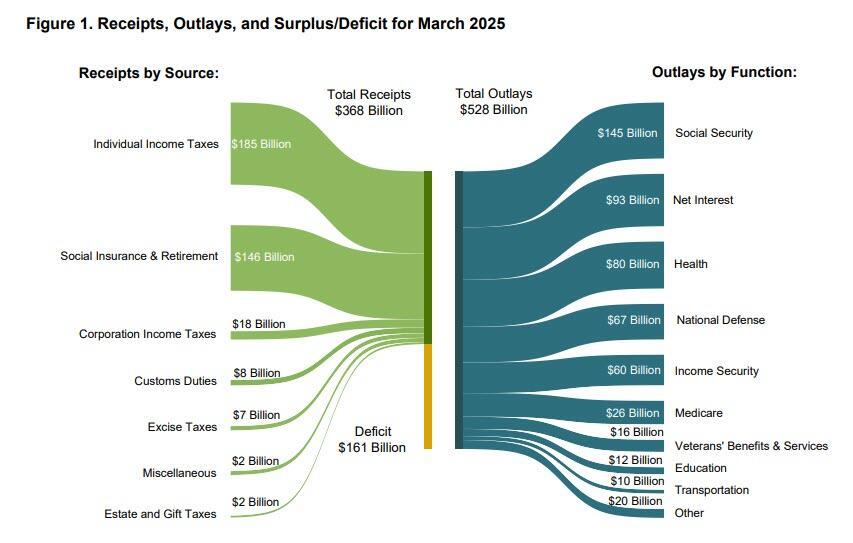 Earlier today the Treasury published its revenue and spending report for the month of March, the first month when DOGE was fully operational, and the results were interesting. As shown in the chart below, in March total US government receipts were $368 billion, while spending totaled $528 billion.