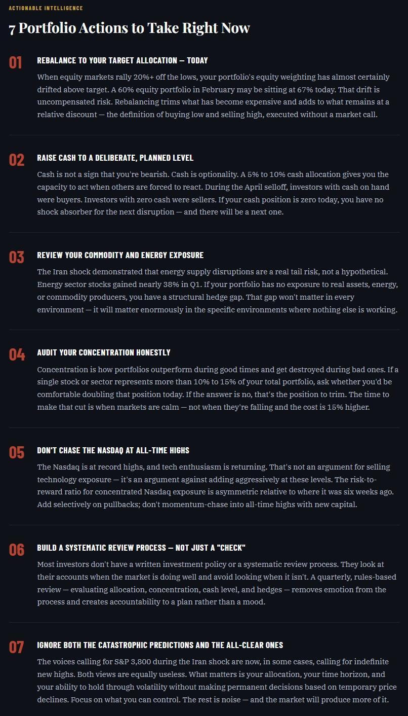 After 30 years of watching this pattern repeat, I can tell you with confidence that no amount of market forecasting substitutes for a sound process. The S&P 500 is trading at roughly 20 times forward earnings, the ten-year Treasury yield is near 4.3%, and the geopolitical situation is improving, or at least markets are pricing it that way. What comes next is unknowable. What you do with your portfolio in the meantime is entirely within your control.