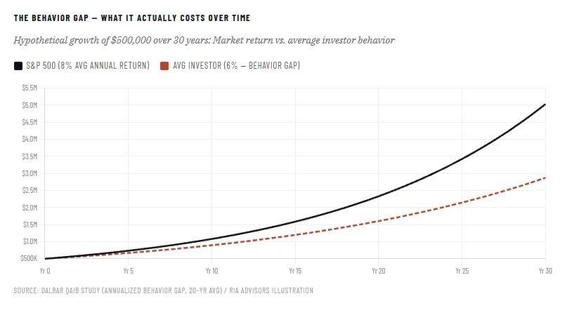 Over 30 years, a two-percentage-point annual shortfall compounds into a staggering wealth gap. A $500,000 portfolio growing at 8% a year becomes roughly $5 million. The same portfolio growing at 6%, because the investor panicked during selloffs and missed recoveries, becomes roughly $2.9 million. That $2.1 million gap is the price of panic. And the investor who sold near the April 2nd sentiment extreme has already paid a portion of it.