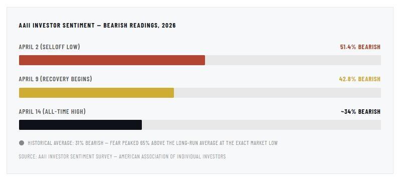 Consider 2022. The Fed’s tightening cycle produced a 9-month bear market that erased ~25% from the S&P 500. The investors who sold in October 2022, when sentiment was just as dark as it was in early April 2026, missed a recovery that added nearly 60% over the next two years. The pattern repeats because human psychology repeats. The catalyst changes. The behavior doesn’t.