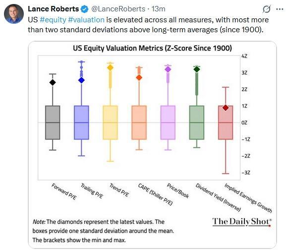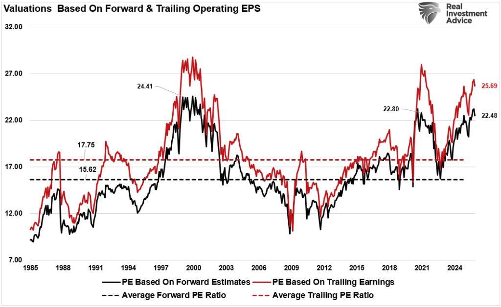 That last sentence is the most crucial. With valuations near cycle highs, (the S&P 500 trades at over 22x times forward earnings, which is well above its long-term average), such assume strong earnings growth and low discount rates. Yet both assumptions are vulnerable. If economic growth undershoots, earnings revisions will follow. Historically, earnings have tended to lag behind the economic cycle. As consumption softens, revenue growth stalls. Margins then compress, especially for companies with high labor or financing costs, and with narrow market breadth and concentration in mega-cap names, the market risk is a sudden repricing of those expectations.
