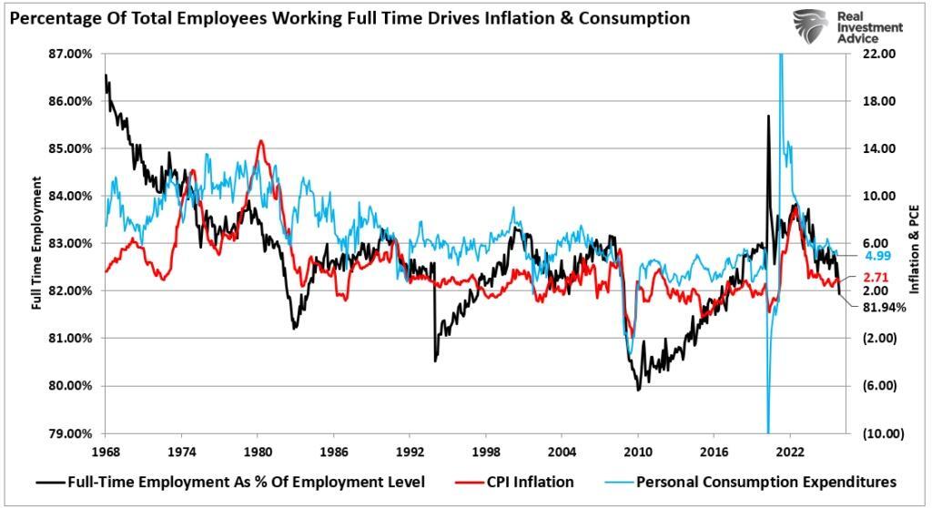 The importance of full-time employment should not be readily dismissed. Full-time employment pays higher wages, provides family benefits, and allows for an expansion of consumption. The decline in full-time employment currently is normally associated with recessions rather than expansions. Economic growth, inflation, and personal consumption are trending lower, given that employment, particularly full-time employment, supports economic supply and demand.