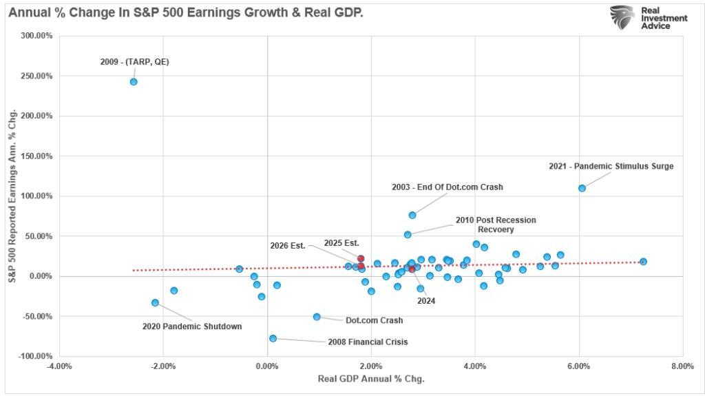 Furthermore, economic growth relies heavily on consumer spending, which accounts for nearly 70% of U.S. GDP. For that consumption to persist or grow, consumers must have rising incomes, which come from employment and wage growth. Without job creation or real wage increases, consumption growth stagnates, and the earnings narrative breaks down. As shown, when economic growth declines, so do earnings growth rates.