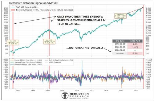 For market technicians, the pattern is uncomfortably familiar. Market-topping processes throughout history, from 2000 to 2007 to 2021, have been preceded by precisely this kind of internal deterioration: narrowing leadership, defensive outperformance, and a growing divergence between price-weighted and breadth-based indicators. The question is whether history is rhyming again, or whether the analogy is misleading.
