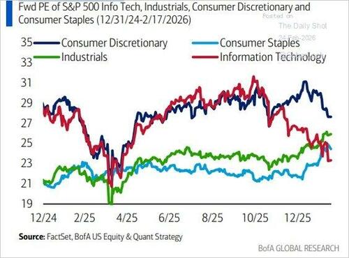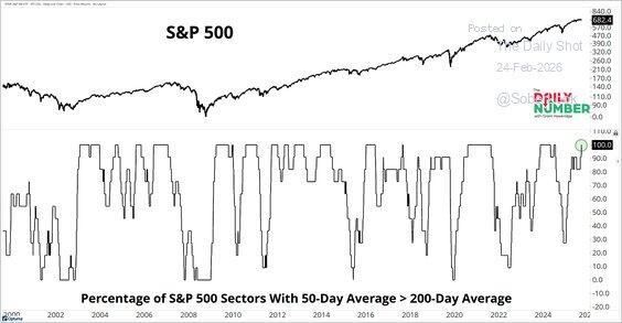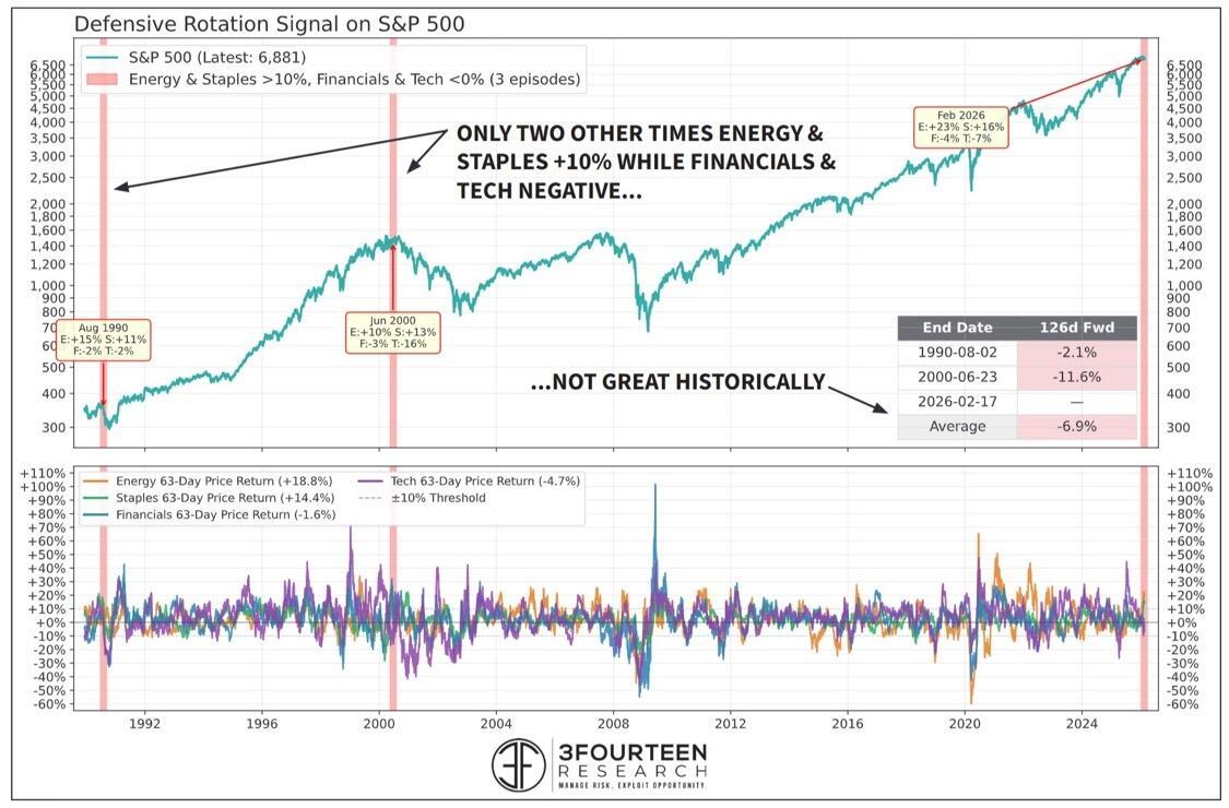 The big risk worth watching is that tariff policy remains in legal limbo after the SCOTUS ruling. The AI disruption narrative is broadening beyond software into financials and logistics. And the extreme rotation into Energy, Materials, and Industrials (up 21%, 17% and 12% respectively) has left positioning dangerously one-sided against Technology.