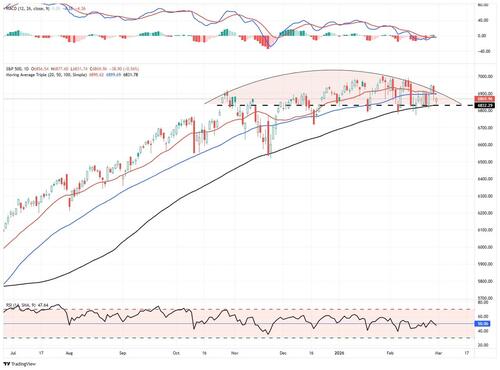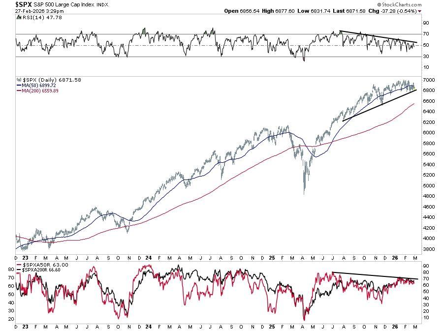 The bull trend is intact, but the “easy money” phase appears mature. The intermediate-to-long-term structure remains constructive. The 200-DMA is rising, breadth is near record levels, and the rotation trade is broadening participation. However, short-term momentum has deteriorated notably. The index is below both its 20- and 50-DMAs, the MACD has crossed bearishly, and the RSI is declining. Layer in the midterm election year seasonal headwinds, hotter-than-expected inflation, and Iran-related geopolitical risk, and the path of least resistance in early March tilts toward further consolidation or a modest pullback before the seasonal tailwinds attempt to reassert themselves. I suspect we will get a better entry point for a rally as we move into March. However, use that opportunity to rebalance oversized winners, define risk levels, and avoid chasing strength. Don’t fight the trend, but protect gains if volatility inevitably returns.
