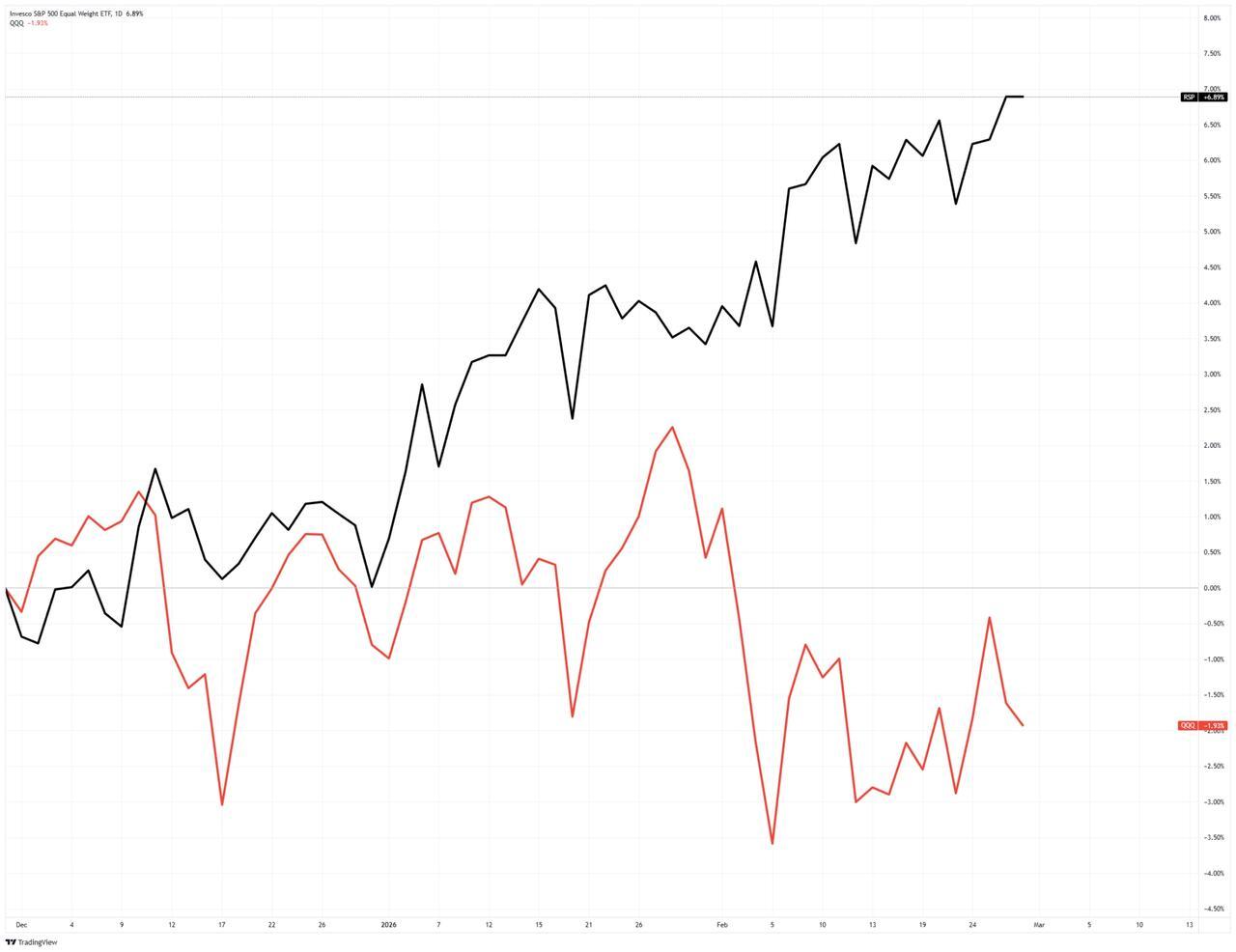 The S&P 500 has spent recent weeks grinding in a range that has tested the patience of both bulls and bears. More notable than the index’s headline price action has been the dramatic shift beneath the surface: utilities, healthcare, and consumer staples have led the tape, while the mega-cap technology stocks that powered the bulk of the post-2022 rally have stalled or retreated. The Nasdaq 100’s underperformance relative to the equal-weight S&P 500 has reached levels not seen since the first quarter of 2022, a period that, it bears noting, preceded a punishing bear market leg.