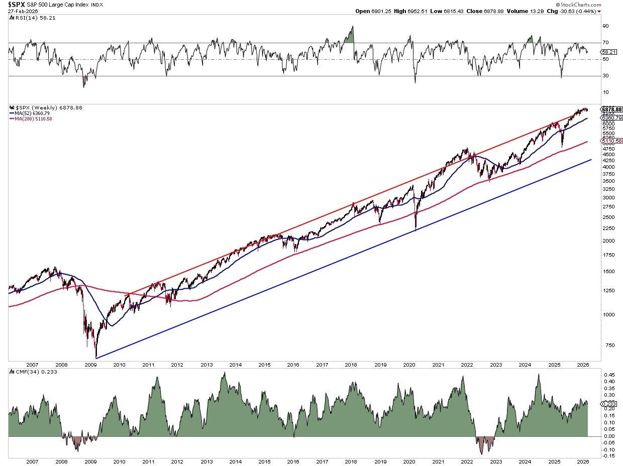 The technical picture, while mixed, is not uniformly bearish either. The S&P 500 remains above its rising 52-week (1-year) and 208-week (4-year) moving averages. That 52-week moving average has been a consistent bullish “line in the sand” that, when lost and confirmed, has historically been one of the most reliable signals that a cyclical bear market is underway. As long as that trend anchor holds, the benefit of the doubt arguably belongs to the bulls. The most important trend line is the 208-week moving average. If that fails, the bears will have control of the market.