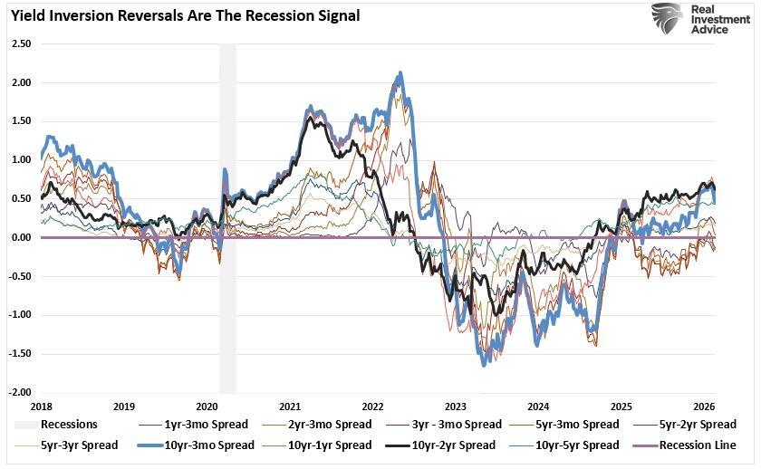 Then there is the yield curve. After a prolonged inversion that began in 2022, the curve’s re-steepening in late 2024 and into 2025 prompted some relief among investors who viewed the normalization as a sign the recession everyone feared had been avoided. But historically, the most dangerous period for equities is not during the inversion itself; it is in the 12 to 18 months after the curve un-inverts. The logic is straightforward: the curve steepens because the Fed is cutting rates in response to slowing growth, and the lagged effects of prior tightening are still working through the economy. By the time the damage becomes visible in earnings, the market-topping process has likely been completed.