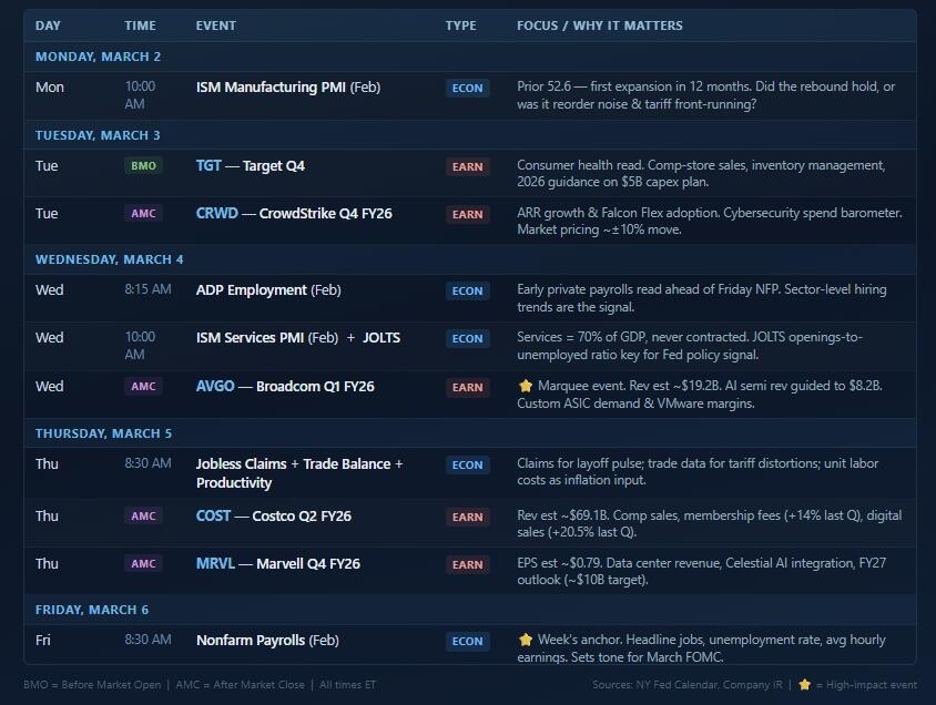 Traders face a packed week of macro data and heavyweight earnings beginning Monday, March 2nd. On the macro side, the week is bookended by two critical reads on the economy. ISM Manufacturing PMI lands Monday morning, after January’s surprise jump to 52.6 (the first expansion in 12 months), markets will scrutinize whether that rebound was genuine or simply a post-holiday reorder effect distorted by tariff front-running. A print below 50 would revive contraction fears and likely pressure cyclicals and small caps; a firm reading above 52 would reinforce the reflation narrative that has lifted Energy, Materials, and Industrials.