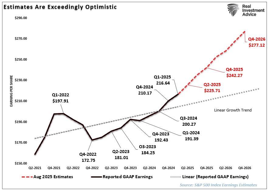 Still, the current level of exuberance is unsurprising given the strongly trending bull market, particularly when Wall Street needs to justify higher valuations. The problem is that such exuberant forecasts rarely come to fruition. For example, in March 2023, S&P Global predicted that 2024 earnings would grow by 13% for the year. In reality, earnings grew by just 9% despite the market rising nearly 28%. In other words, given that actual earnings fell well short of previous estimates, the 2024 market was primarily driven by valuation expansion.