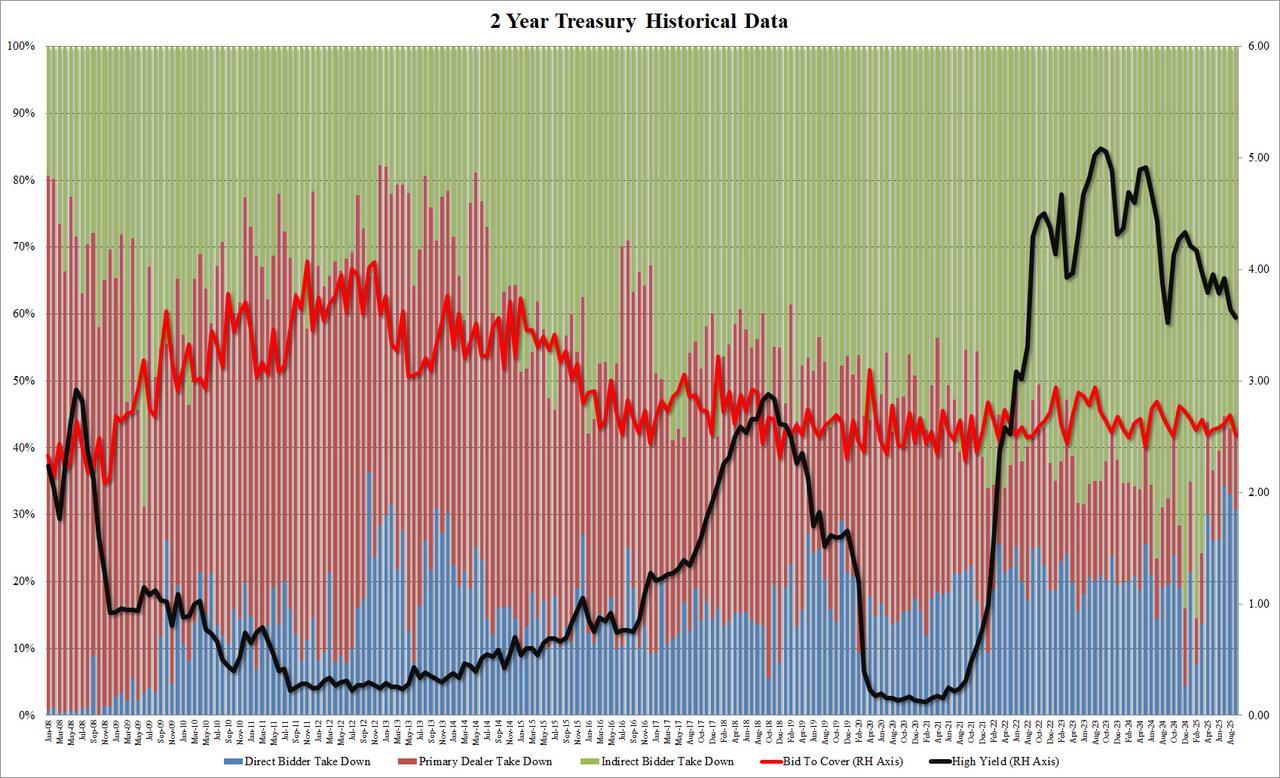 The bid to cover dropped to 2.513, down from 2.691 and the lowest since October 2024; obviously it was below the six auction average of 2.605.